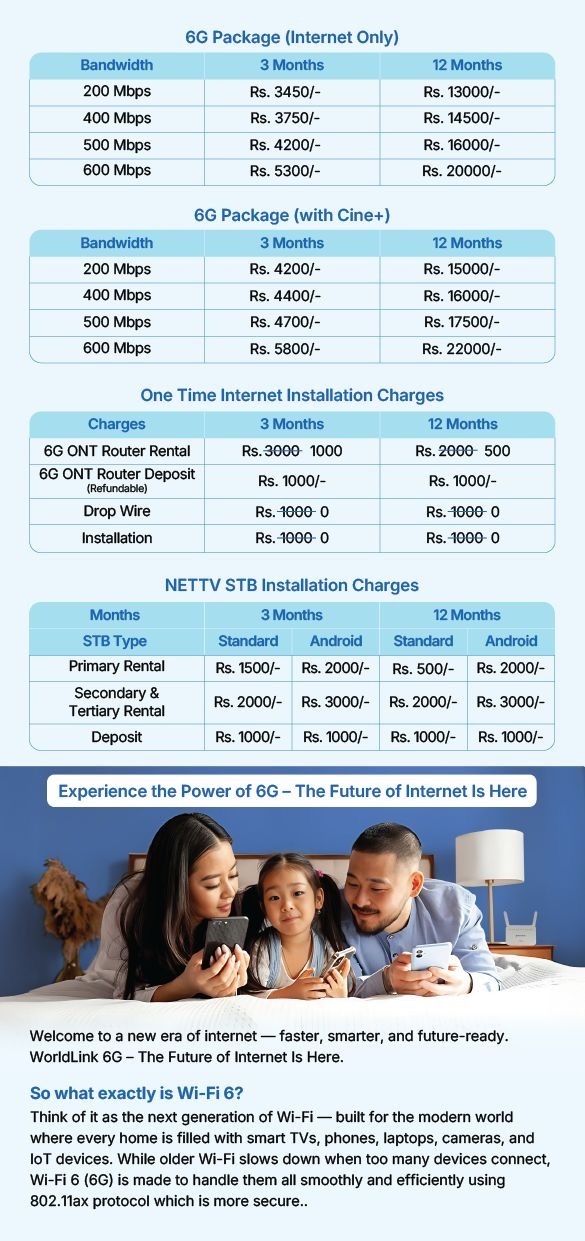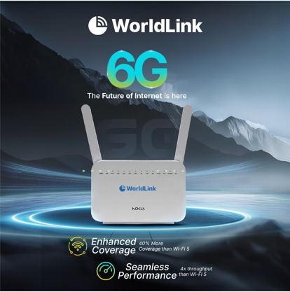 वीरगंज । नेपालको सबैभन्दा ठुलो इन्टरनेट सेवा प्रदायक कम्पनी वर्ल्डलिंकले ‘वाई-फाई 6G’ घोषणा गरेको छ ।